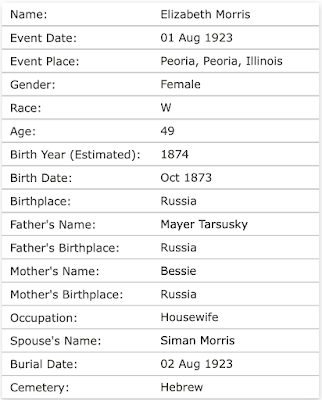So Turiansky morphed to Moses, which became Mose and then Morris. At least we now know who we're looking for. The Census forms suggest that Simon and Elizabeth were married around 1892, but I haven't found a record for this as yet. Bessie, their first child, appears on the Censuses as born in Illinois in 1897.